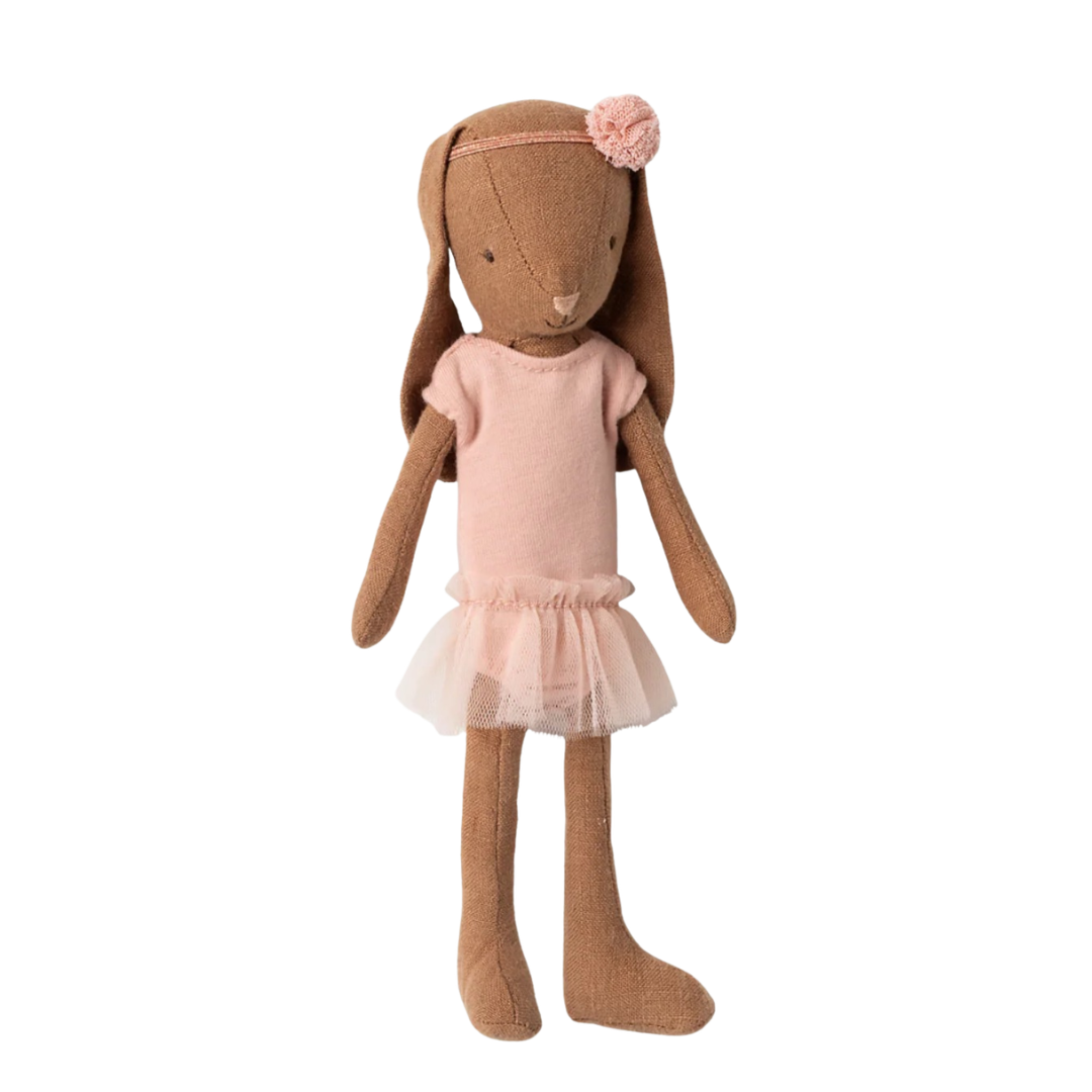 Maileg Bunny Size 1 – charming linen bunny (21 cm) in chocolate brown wearing a rose ballet suit and tulle skirt.