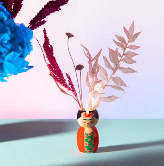 Display your most beautiful flowers in this mini vase of Mexican artist and icon Frida Kahlo. The vibrant hues of red, pink, green and yellow show you the beauty of Frida and her art.