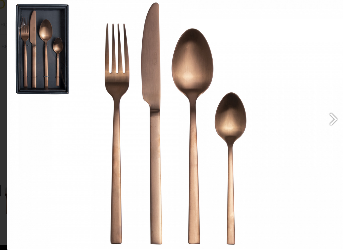 Deze set bevat 4 vorken, 4 messen, 4 lepels en 4 koffielepels in koperkleur. Koper is één van de trendkleuren van dit moment, een must-have voor jouw collectie!