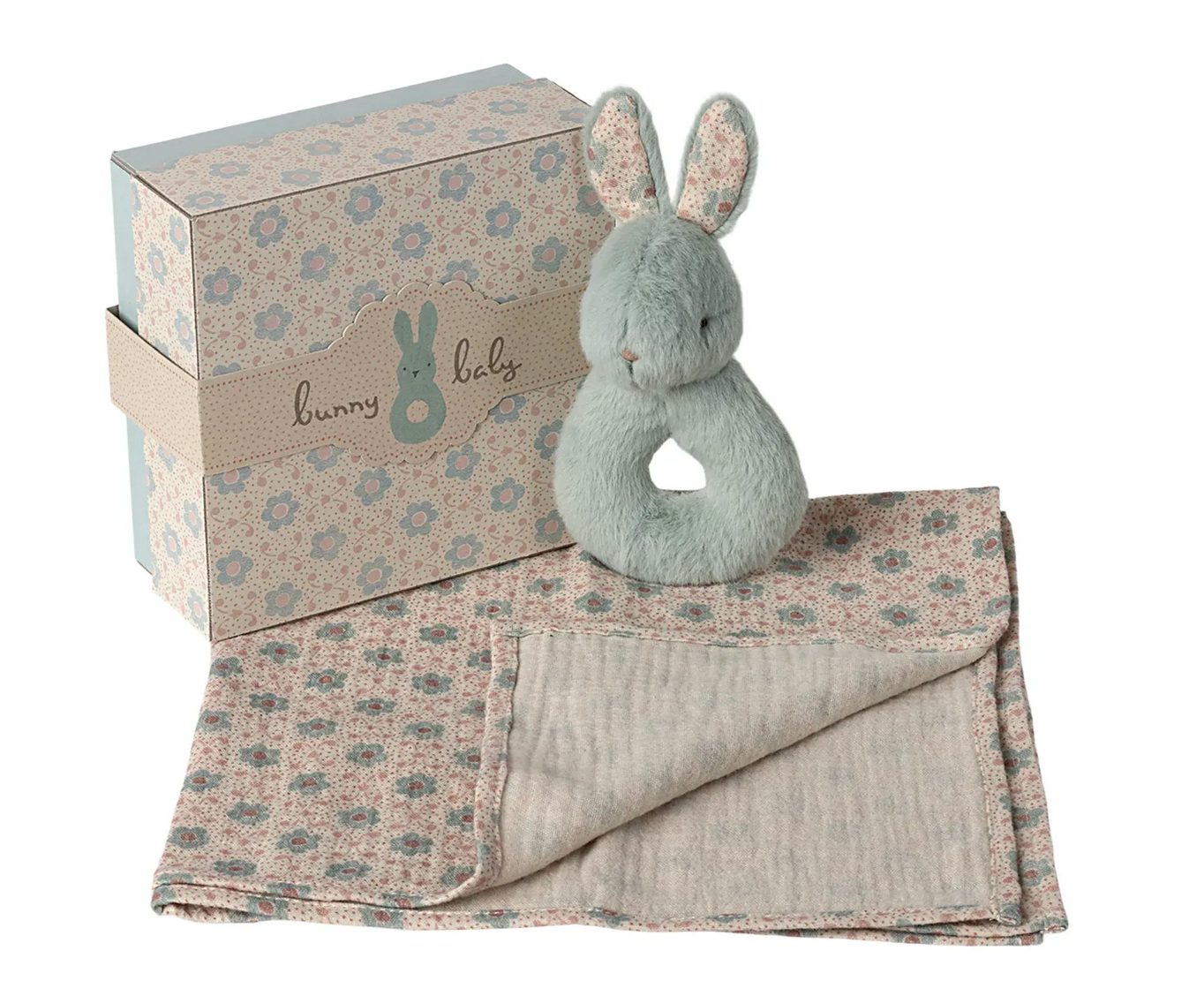 Een perfect cadeau-idee voor de allerkleinsten. De set bestaat uit een zacht katoenen doekje en een kleine konijnenrammelaar, die een zacht geluid maakt. Het geheel wordt geleverd in een mooie cadeauverpakking.