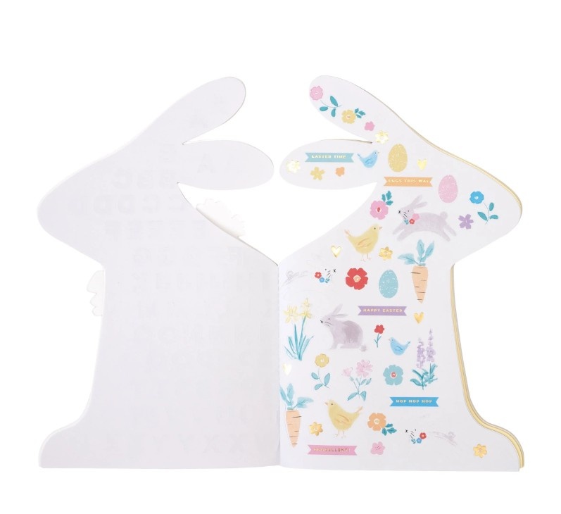 - Inclusief 6 pagina's met stickers met iconische lente-ontwerpen van konijntjes, wortels, eieren, vogels en bloemen, en letters van het alfabet